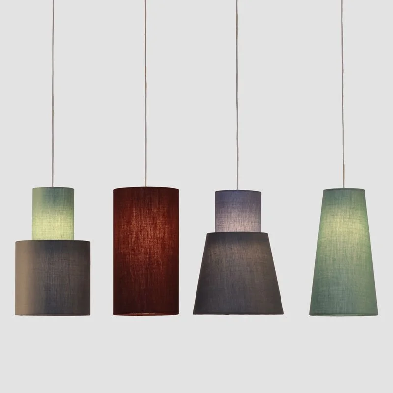 Pendant lights in linen fabric, in soft shades of grey, green, and burgundy